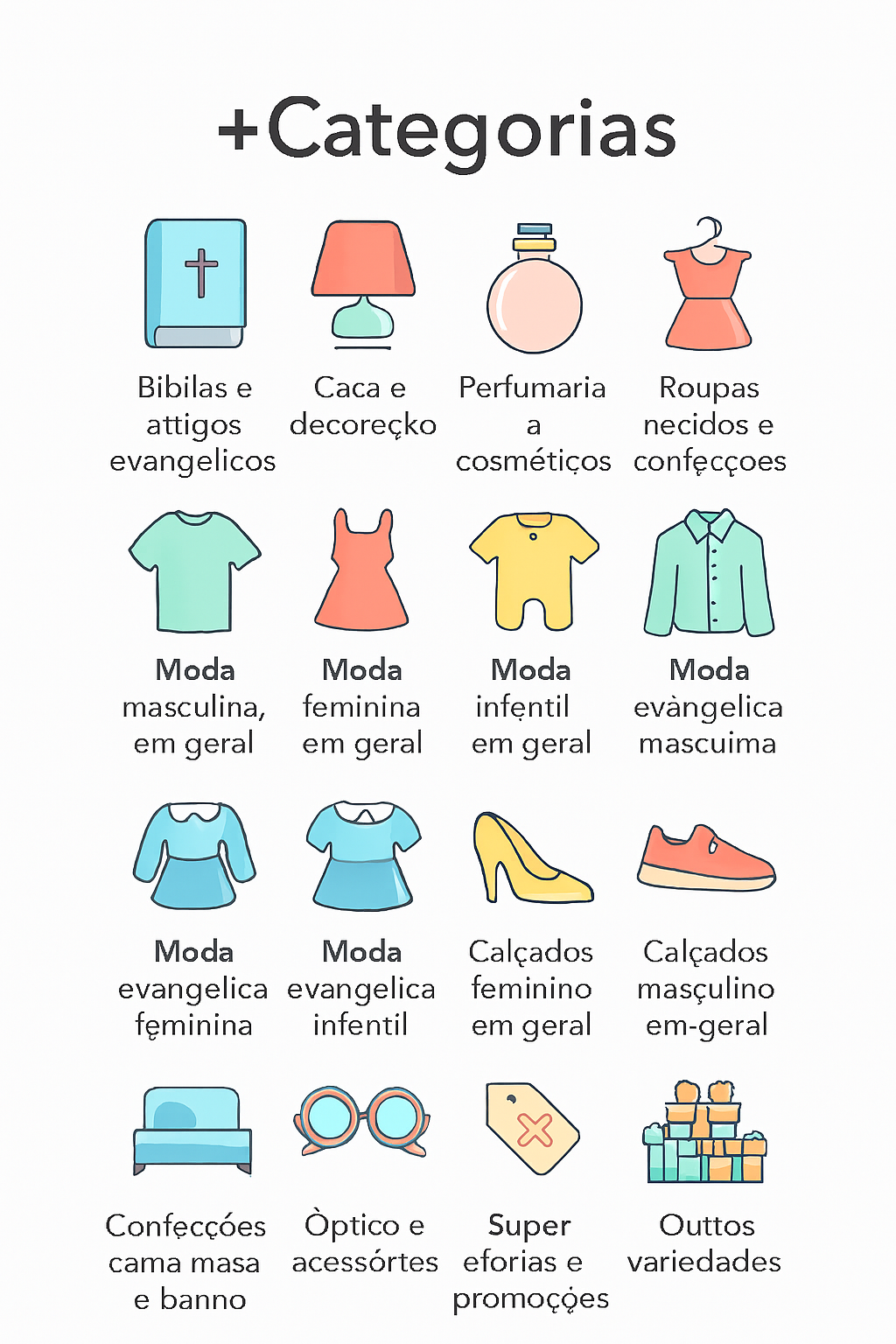Aqui você encontra Bíblias e artigos evangélicos, itens para casa e decoração, perfumaria e cosméticos, moda masculina, feminina e infantil, além de calçados, confecções cama, mesa e banho e muito mais.